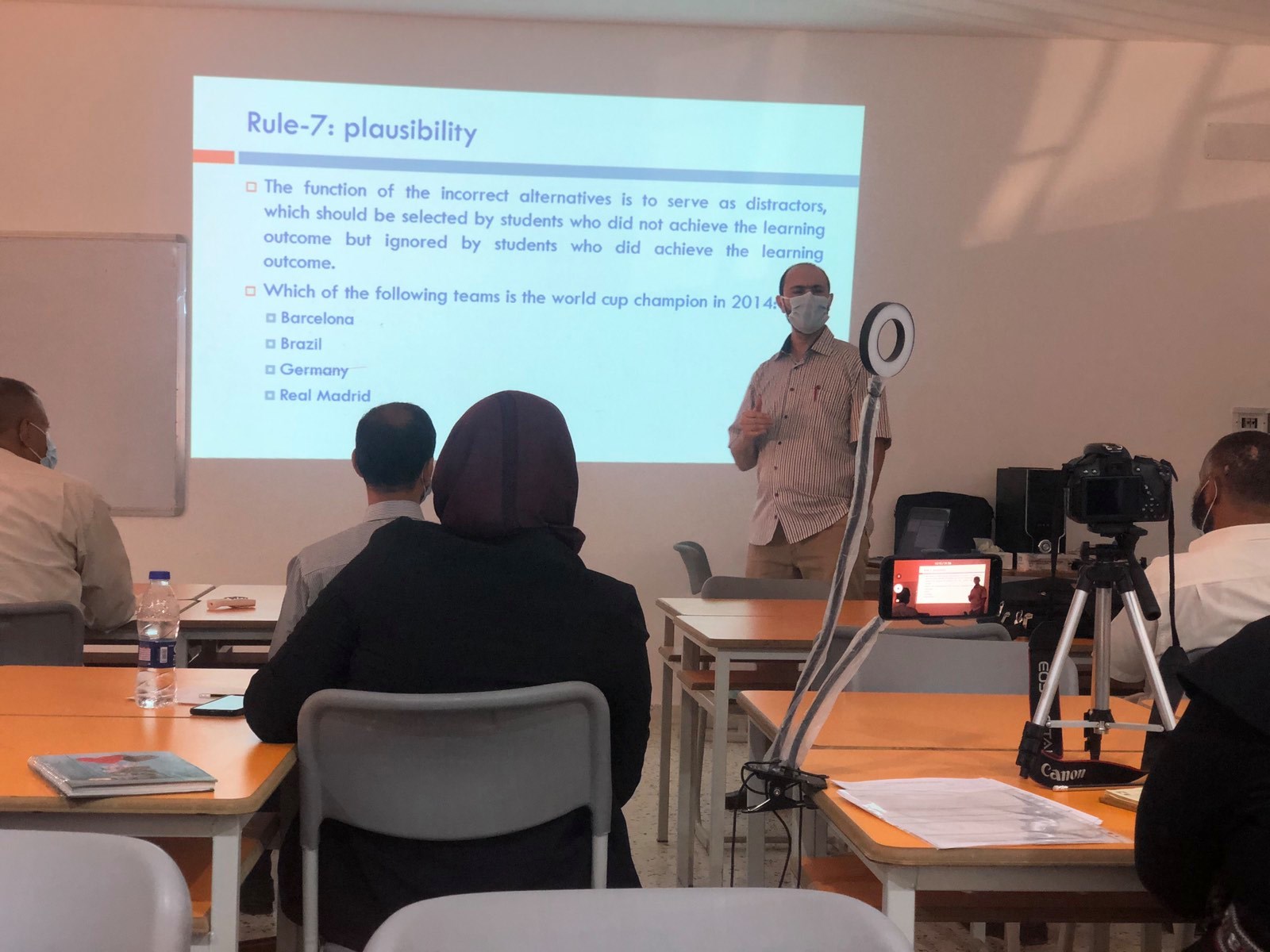 As part of the annual program for the professional development of faculty members and supporting cadres at the Faculty of Pharmacy, the Faculty of Pharmacy team participated, on Saturday, July 11, 2020, in a workshop on the standards of exam questions. The first part of the workshop was carried out on two sessions, the first spanned the first two and a half hours and the other session for two hours. During the sessions, the goals required of the workshop were reviewed, discussed and trained on. This included reviewing the advantages and disadvantages of the different types of exam questions and in particular the Multiple-choice questions and how to prepare the exam questions in a correct manner, and how to evaluate it before using it as part of an exam.