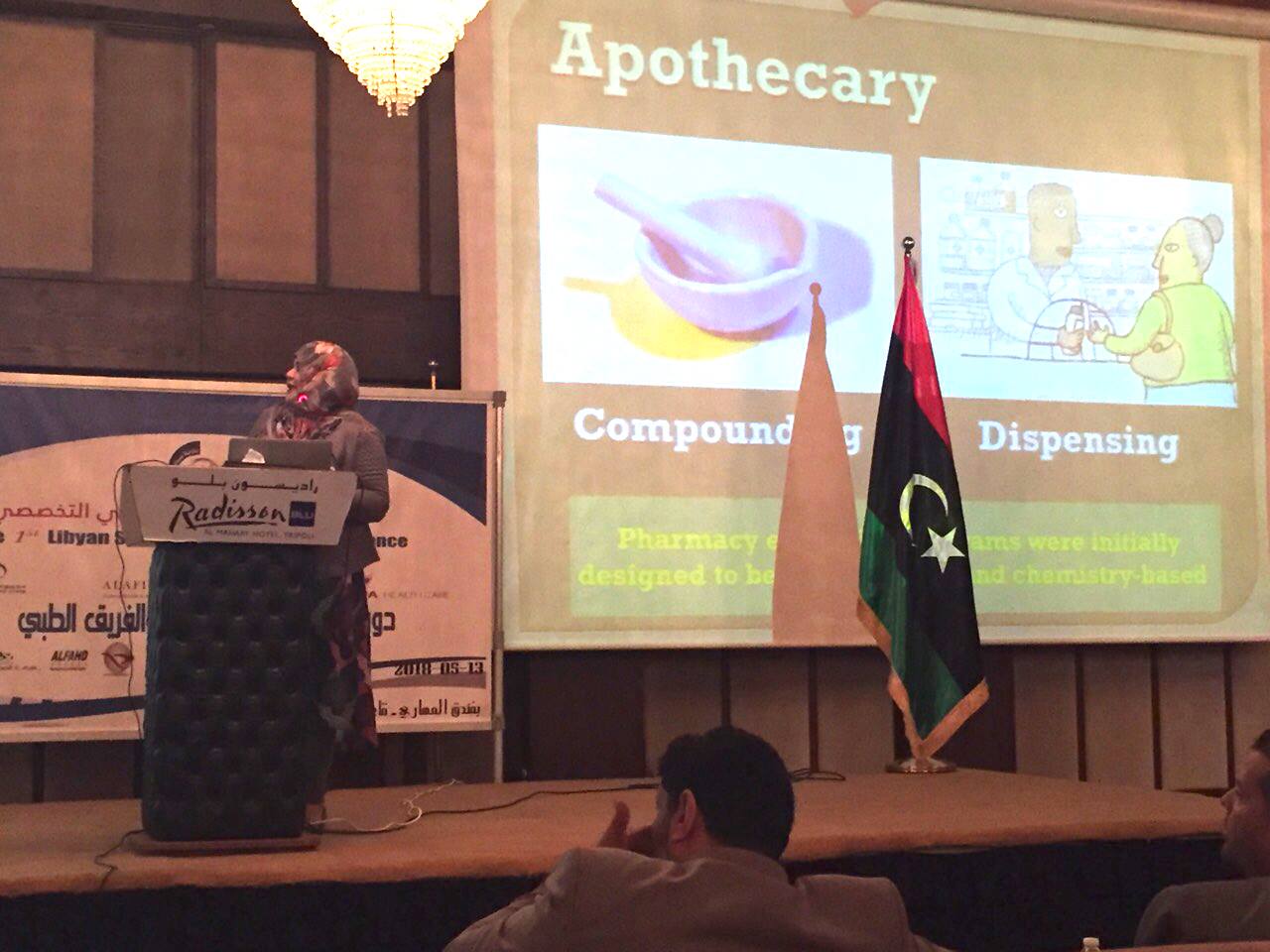 Responding to a generous invitation of the General Syndicate of Pharmacists in Libya, the Faculty of Pharmacy at the Libyan International Medical University (LIMU), participated in the “First Scientific Conference of the Specialized Libyan Pharmacist” that was held at Al-Mahary Hotel in Tripoli on 13th May 2018. Dr. Salma Bukhatwa; Dean of the Faculty of Pharmacy at LIMU, presented a scientific paper entitled "Pharmacy Education and Practice". The conference was a great opportunity for many hospital Pharmacists to present their work experiences at different hospitals from different regions in Libya. The conference also reviewed the latest news regarding the adoption of the Pharmaceutical Arab Board in the field of Clinical Pharmacy that is expected to be announced in October 2018