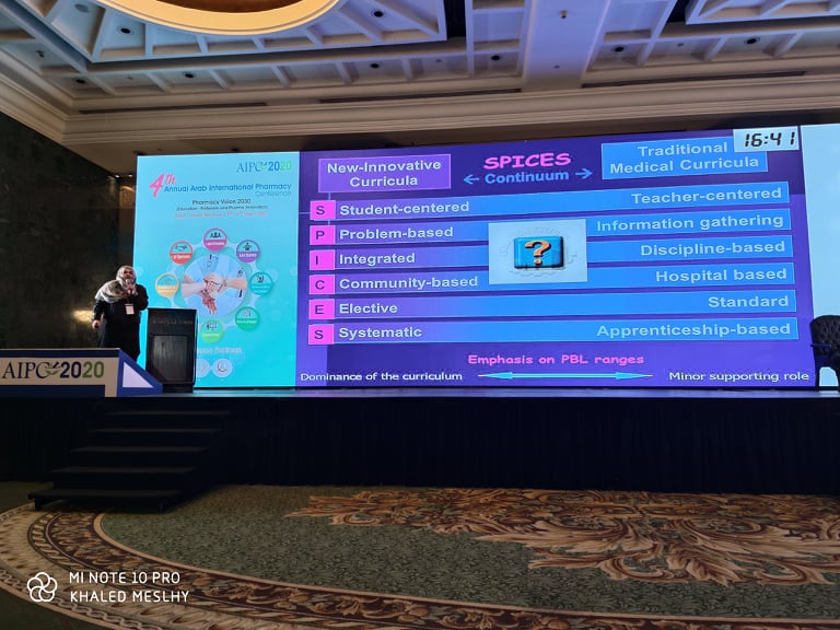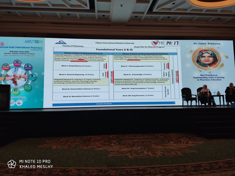 Dr. Salma Bukhatwa the Dean of the Faculty of Pharmacy at the Libyan International Medical University (LIMU) participated in the Fourth International Conference of Arab Pharmacists in Cairo, held on the 8th and 9th of March 2020. The Dean was one of the conference speakers and her speech was about the use of different interactive teaching methods in implementing the PharmD program that the university had adopted since 2016. The PharmD program at LIMU obtained its accreditation from the National Center for Quality Assurance and Accreditation of educational institutions in 2018.